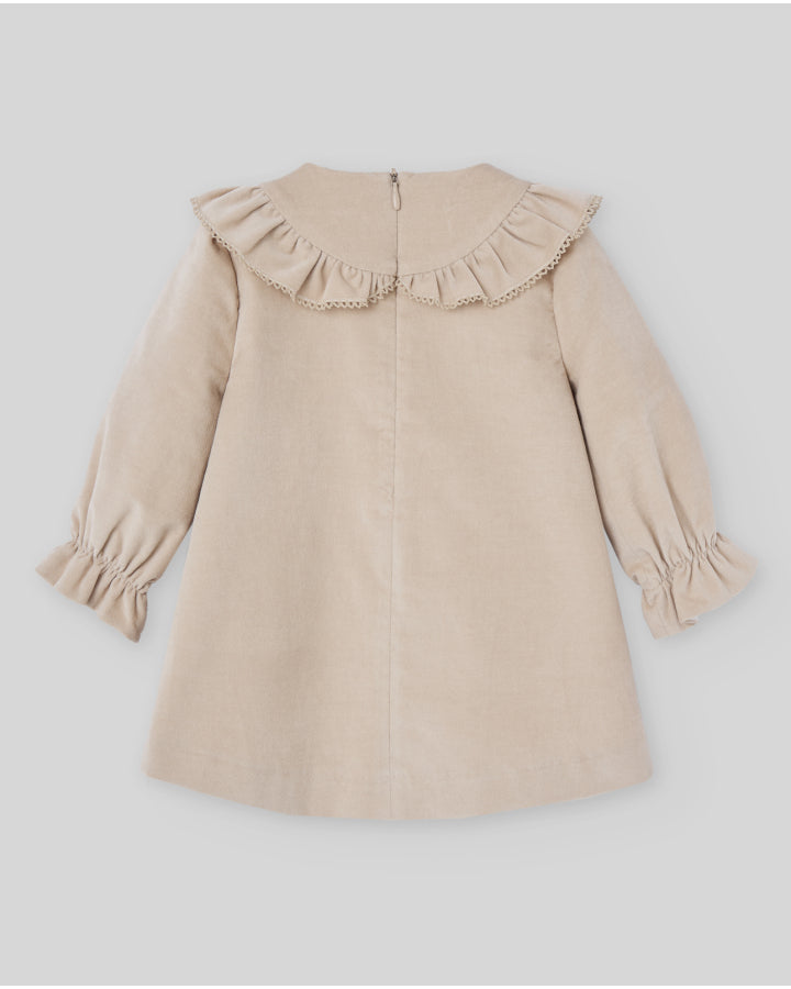 Vestido de velvetón con bordado en el delantero. Cuello con puntilla y manga larga con puños fruncidos. Cierre trasero con cremallera invisible.