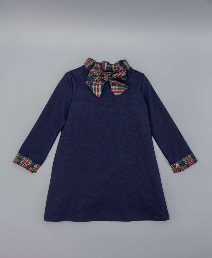 Vestido azul marino de punto milano para niña, de forma evasé que aporta movimiento y comodidad. El lazo de cuadros en el cuello y los puños con botón están rematados con un pequeño volante en el mismo estampado de cuadros. Confeccionado en tejido suave y cómodo. Disponible en tallas desde 2 hasta 16 años. Perfecto para ocasiones especiales y uso diario.