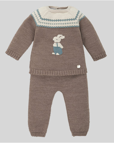 Long-sleeved cardigan with a jacquard rabbit print on the front. Round neck and yoke with a contrasting geometric pattern. Its chunky knit fabric makes it ideal for colder days.
