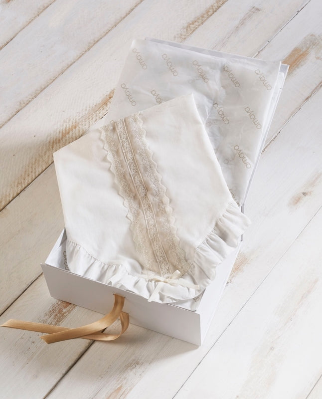 Manta de bautizo elaborada en tonos crudo y tostado, enriquecida con delicada puntilla y volante que añaden refinamiento a la prenda.