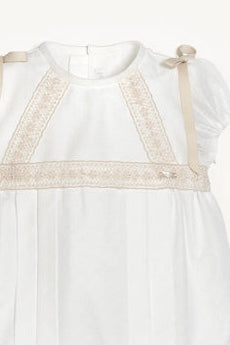 Pelele de bautizo confeccionado en tul plumeti combinado con organza, tejidos que ofrecen un acabado impecable.